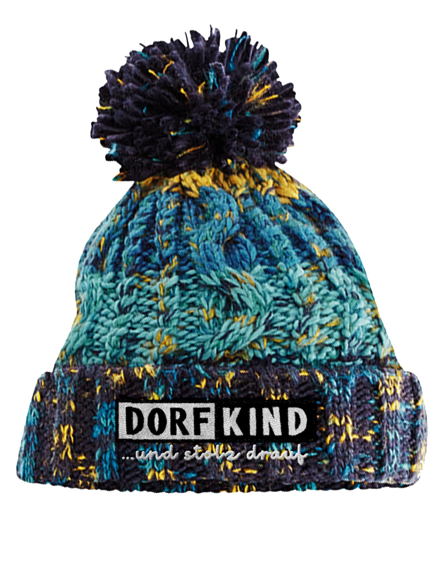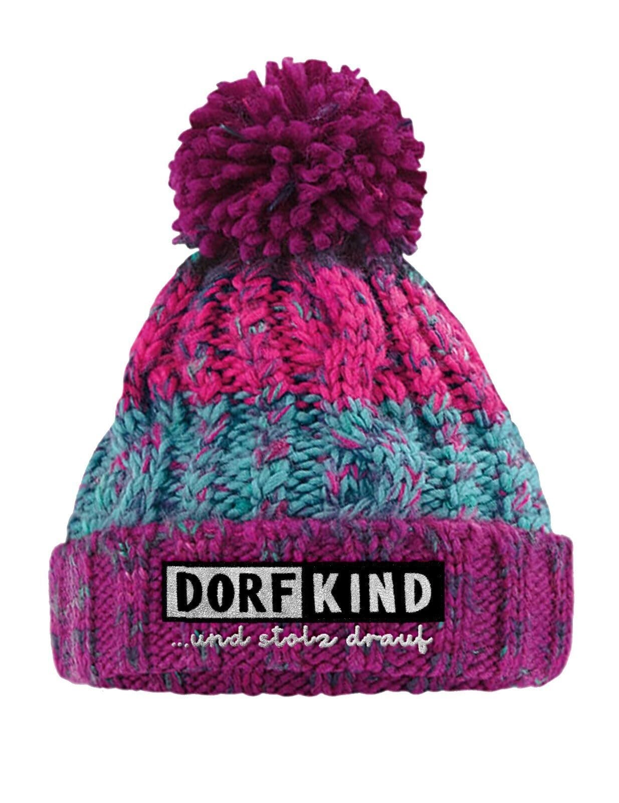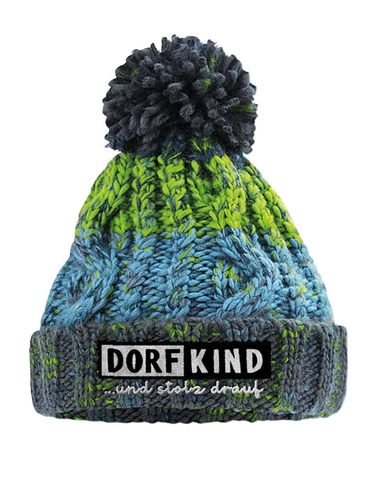 Bommelmütze mit Stickerei Dorfkind und stolz Drauf aus mehrfarbigem Strick mit Zopfmuster doppellagig warm gefüttert mit Thermalband Unisex Wintermütze
