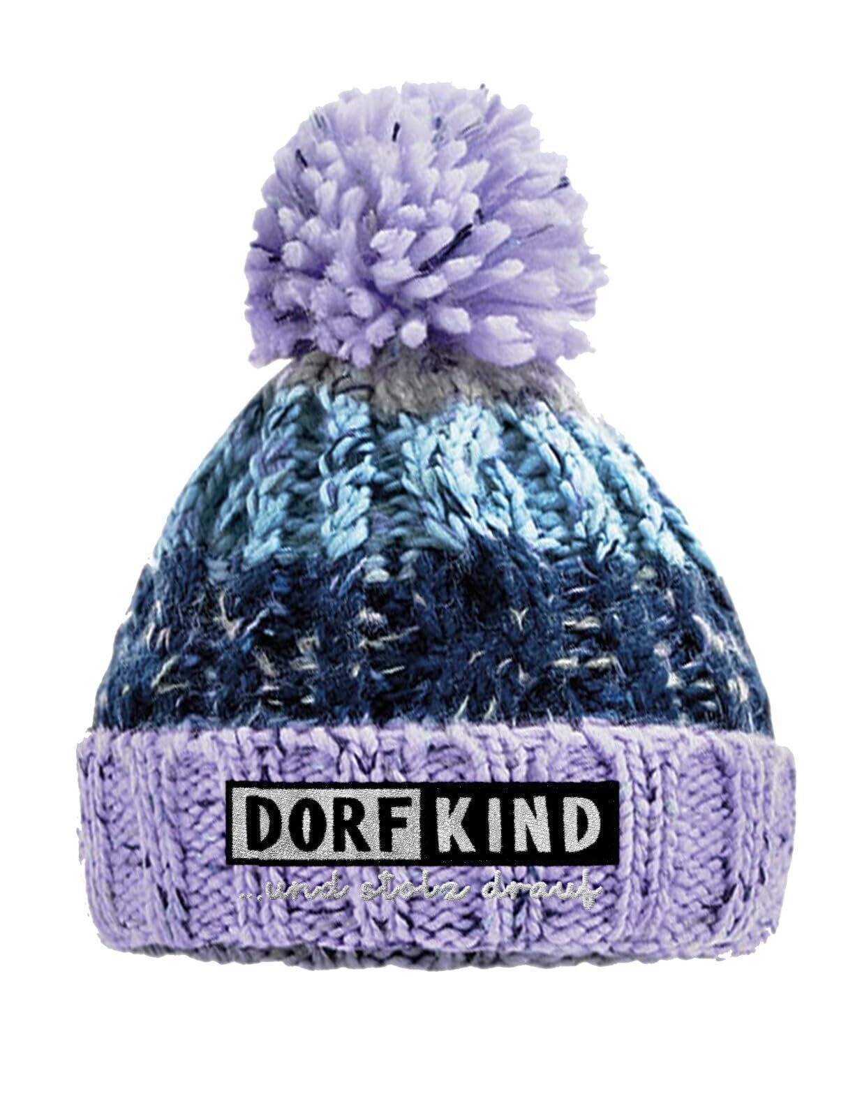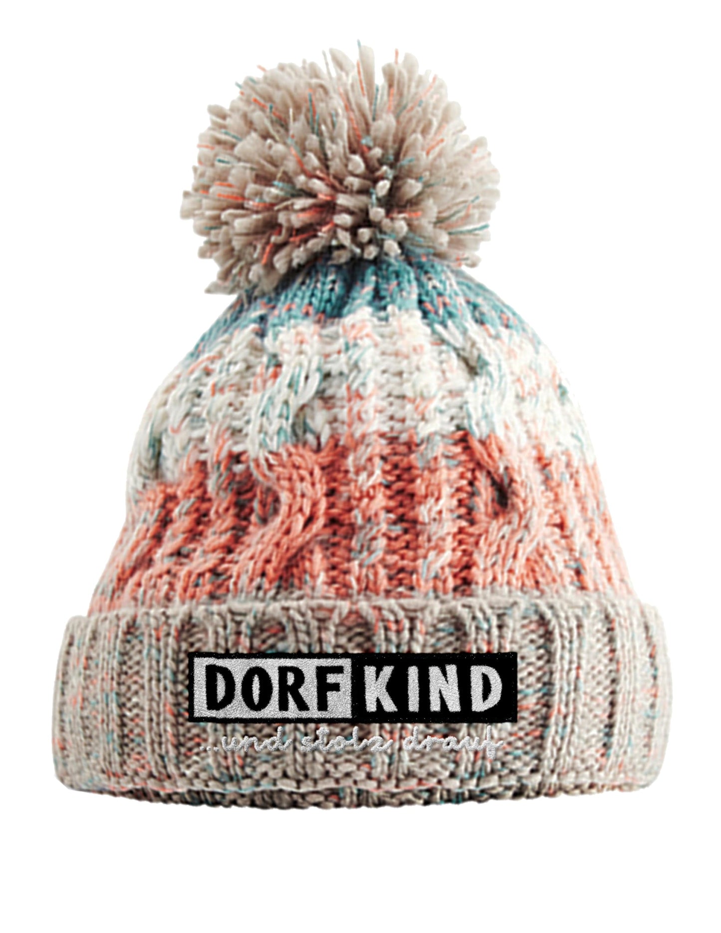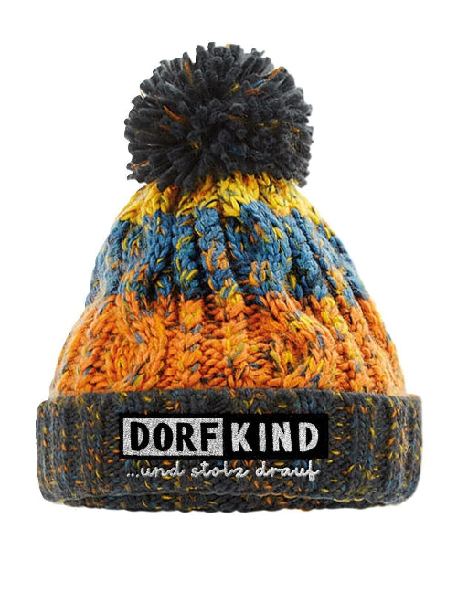 Bommelmütze mit Stickerei Dorfkind und stolz Drauf aus mehrfarbigem Strick mit Zopfmuster doppellagig warm gefüttert mit Thermalband Unisex Wintermütze