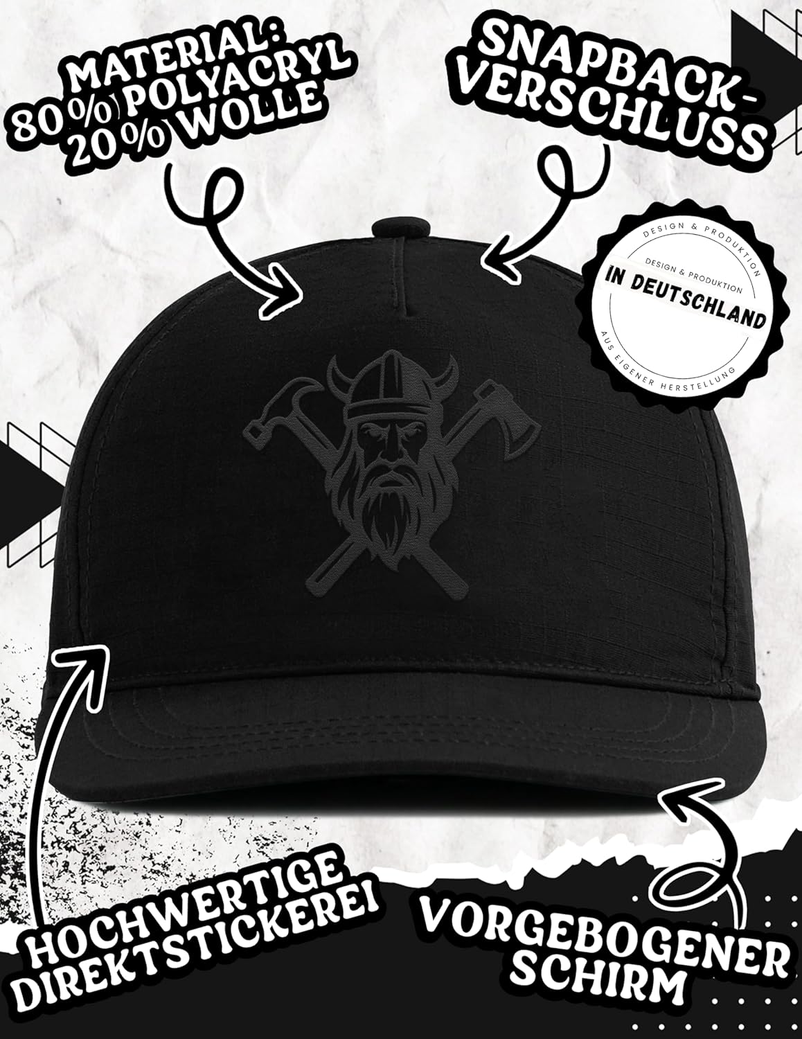 Snapback-Cap mit Wikinger-Stick – Bestickte Cap mit Helm, Axt & Hammer für Handwerker, Bushcrafter, Zimmerer, Viking-Fans und alle mit Stärke im Alltag & Beruf