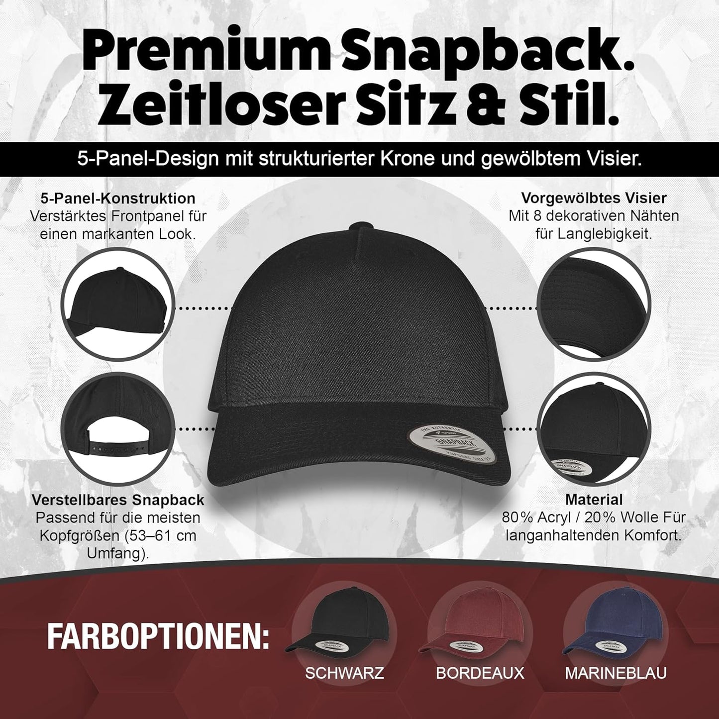 Die Cap besteht aus einem robusten Materialmix: 80 % Polyacryl und 20 % Wolle. Das sorgt für angenehmes Tragegefühl, hohe Formstabilität und Alltagstauglichkeit. Der Snapback-Verschluss auf der Rückseite lässt sich stufenlos einstellen – passend für Kopfumfänge zwischen 53 und 61 cm. Die 5-Panel-Konstruktion mit verstärkter Front sorgt für optimalen Sitz. Ob du dich bewegst, arbeitest oder einfach draußen unterwegs bist – diese Cap sitzt und bleibt dort, wo sie soll.