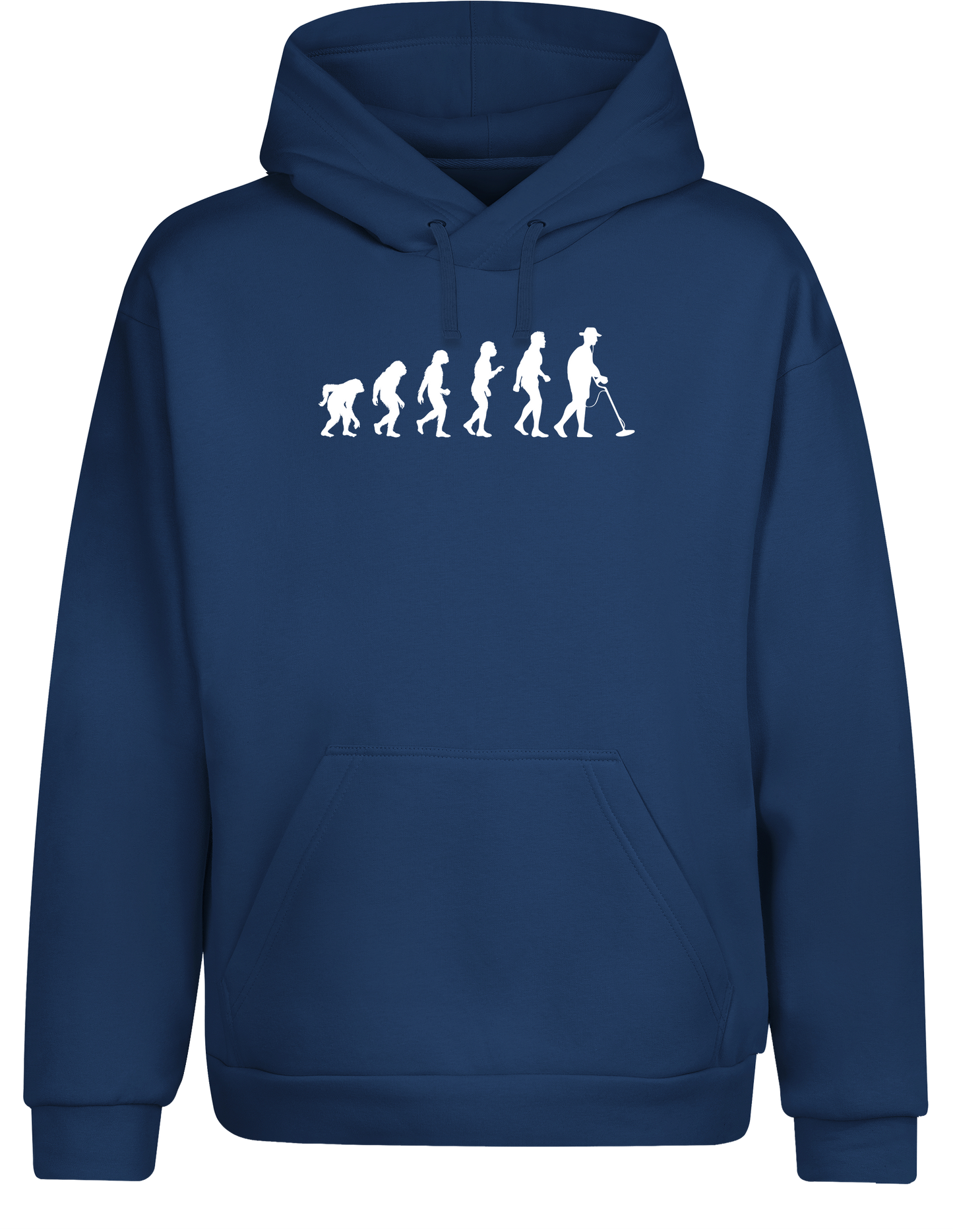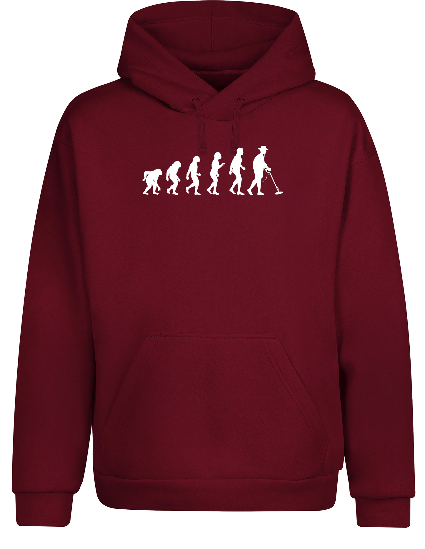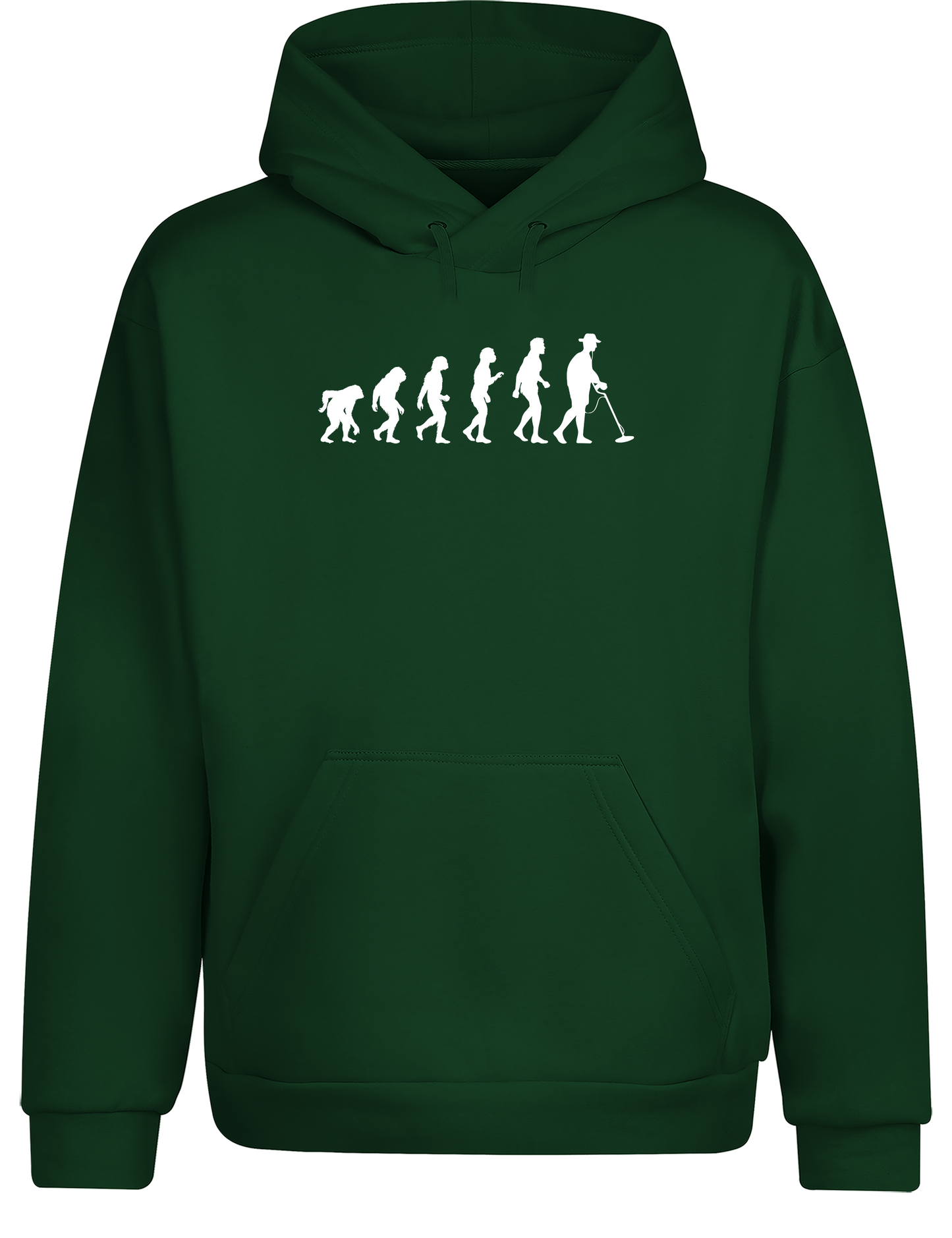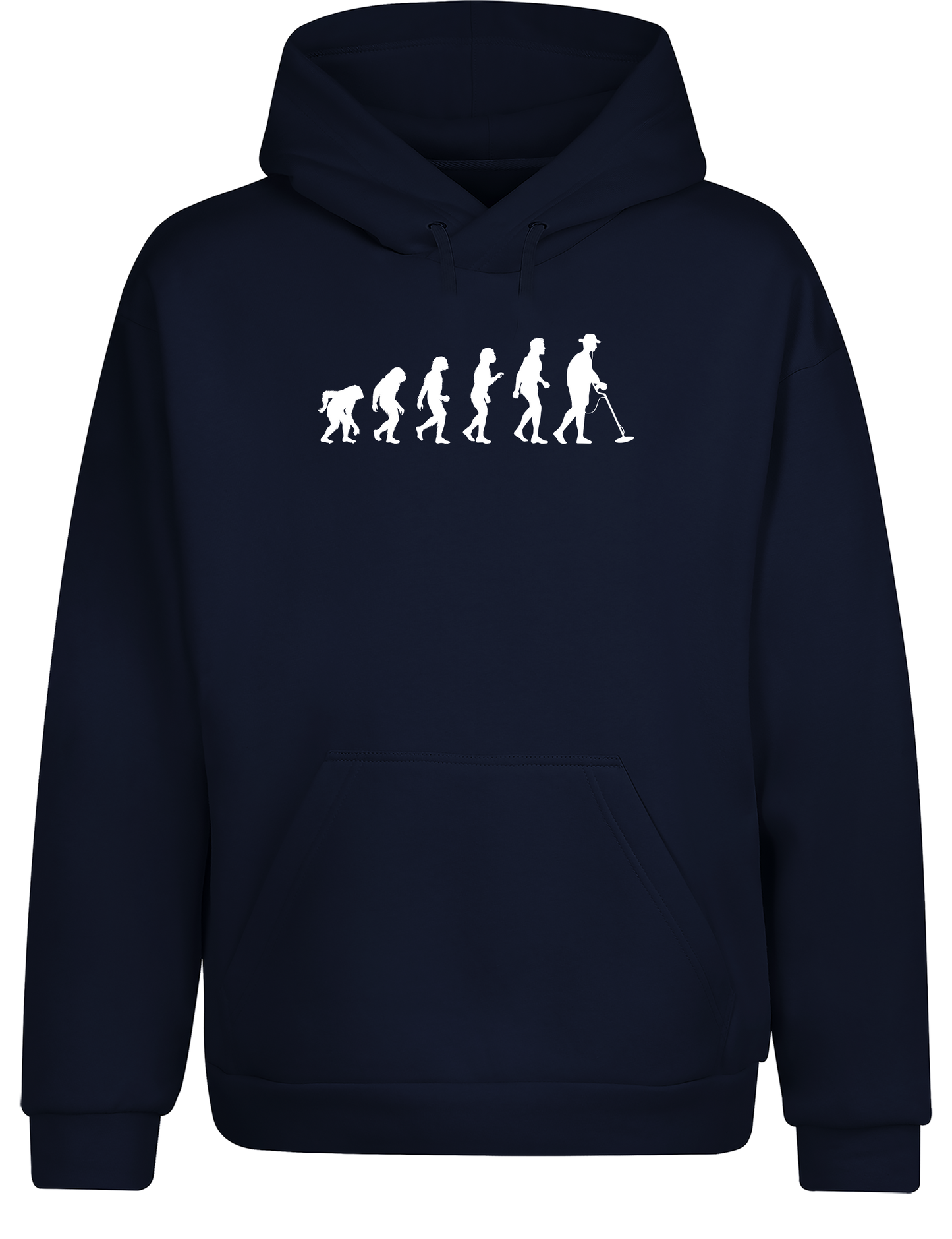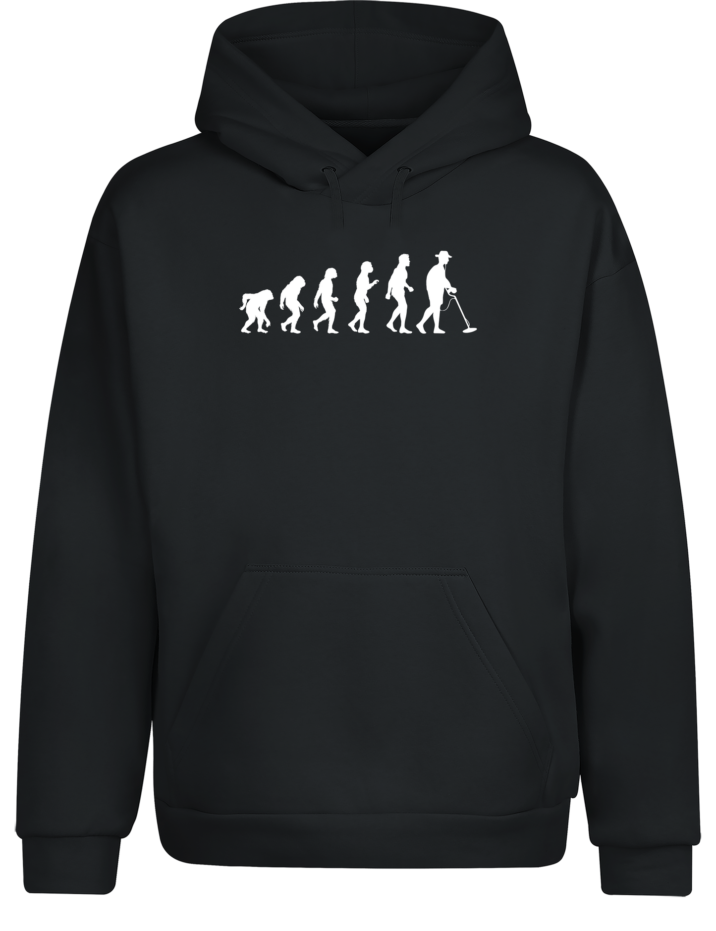Warm, bequem und mit einem Augenzwinkern: Der Hoodie „Evolution des Sondelns“ zeigt die Entwicklung vom Urmenschen bis zum Schatzjäger mit Metalldetektor.