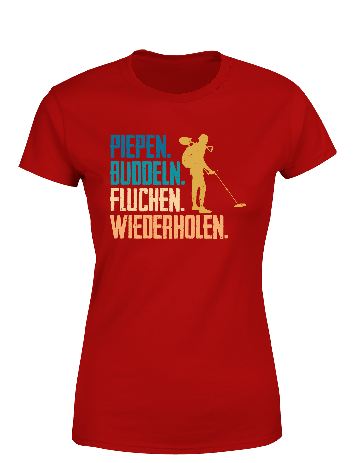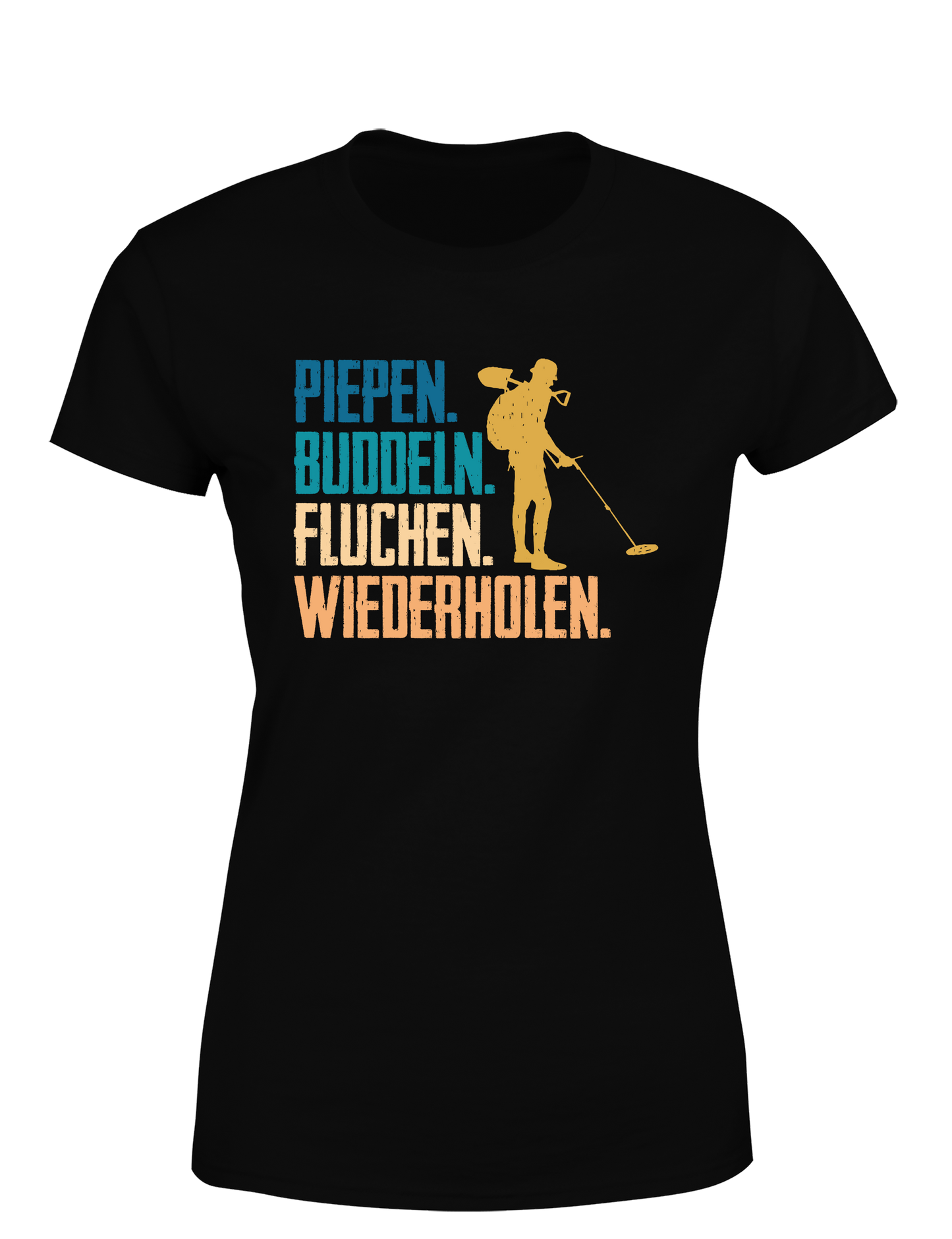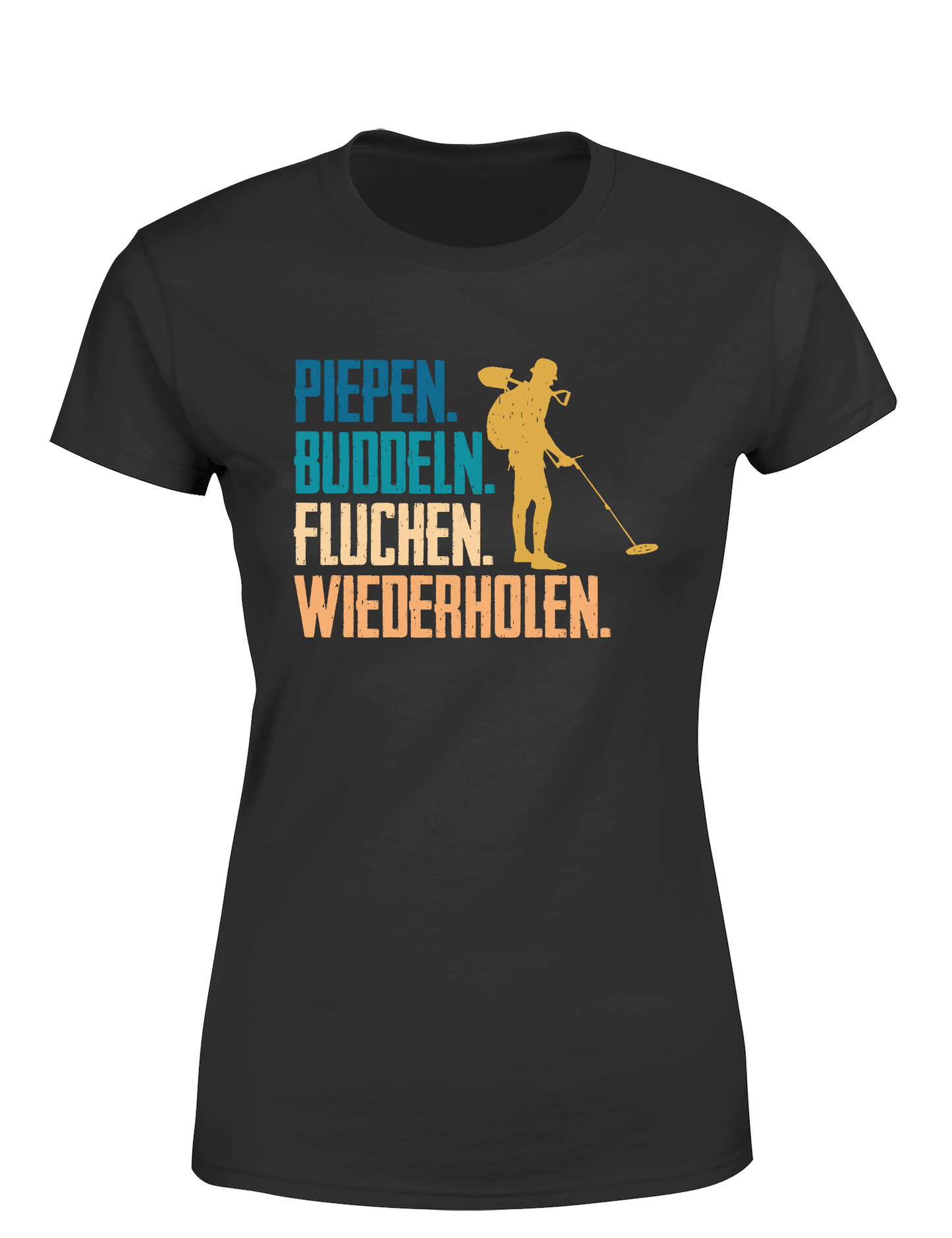 Piepen, buddeln, fluchen, wiederholen“ – jede Schatzsucherin kennt diesen Ablauf. Mit diesem Damen T-Shirt zeigst du deine Leidenschaft fürs Sondeln mit Humor.